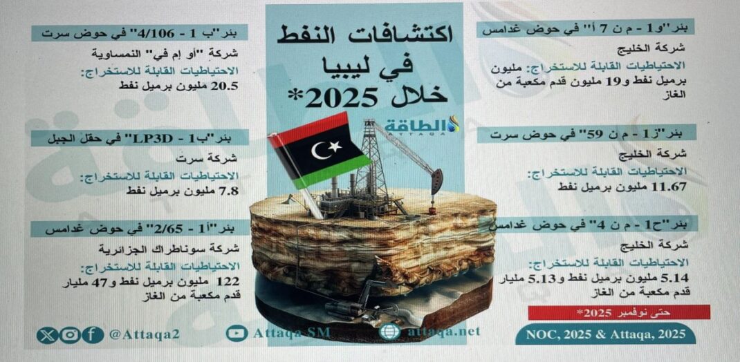 أسفرت اكتشافات النفط في ليبيا 2025 (منذ بداية العام وحتى نوفمبر/تشرين الثاني) عن إضافة 168 مليون برميل للاحتياطيات، بحسب رصد سابق أجرته وحدة أبحاث الطاقة.